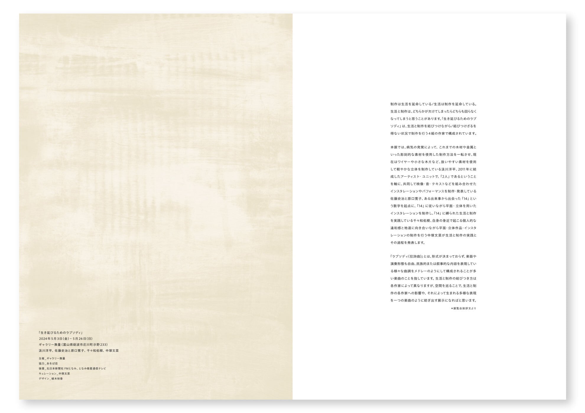 2024年にギャラリー無量(富山県砺波市)で開催された「生き延びるためのラプソディ」の記録集。参加作家は汲川洋平・佐藤史治と原口寛子・千々和佑樹・中塚文菜の4組です。