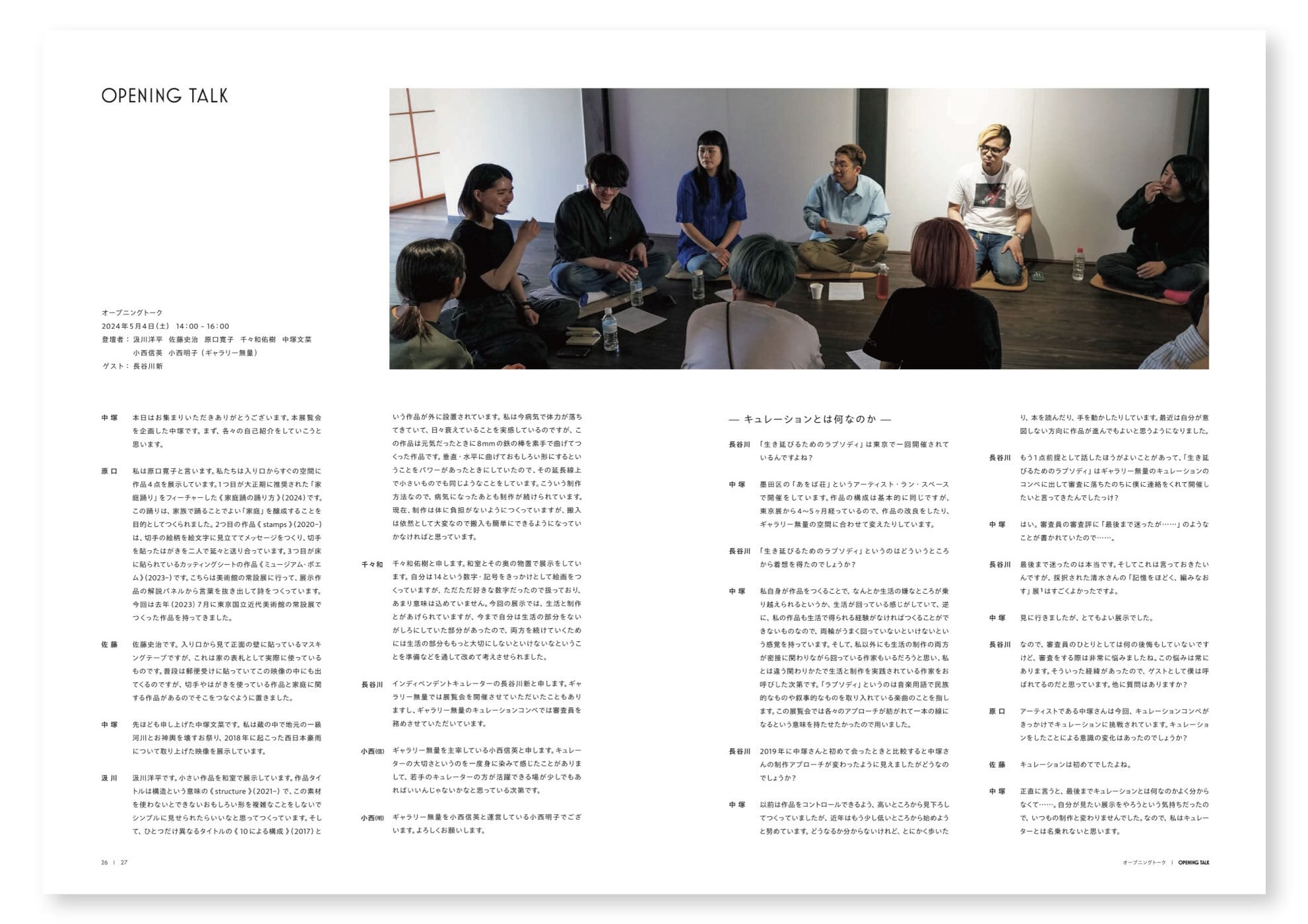記録集には会場写真のほか、各参加作家が記した「生活と制作とは」についてのテキストや、インディペンデント・キュレーターの長谷川新氏をゲストに招いたオープニングトークの記録、黒部市美術館学芸員の尺戸智佳子氏による展評などが載っており、読み応えのある充実の内容になっています。